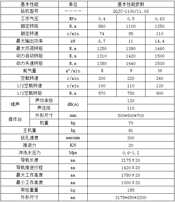 ZQJC-1000/11.0S气动架柱式钻机主要是以压缩空气为动力,适用于探测地 质构造煤层、探放水、抽放瓦斯、煤体注水、卸放压力孔、巷道贯通超前孔、巷道锚杆支护孔及 其他特殊用途。